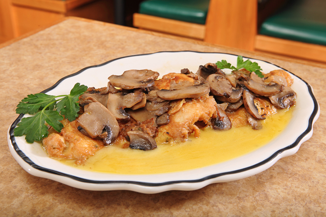 - two boneless chicken breasts with sauteed mushrooms in a white wine and lemon sauce