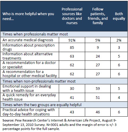 In the national survey, adults were asked which group is more helpful when they need certain types of information or support: health professionals such as doctors and nurses or peers such as fellow patients, friends, and family. A relatively clear pattern of responses emerged: When the issue involved technical issues related to a health issue, professionals held sway. When the issue involved more personal issues of how to cope with a health issue or get quick relief, then non-professionals were preferred by most patients.